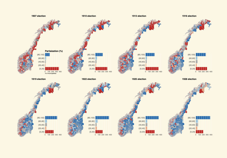Slik kom de politiske partiene inn i de norske kommunestyrene. Her ser du utviklingen i partifiseringen (Partialization) i alle norske kommuner ved lokalvalg fra 1907 til 1928. Kommunen er markert som blå når de politiske partiene har overtatt. Figuren ser du best på en litt større skjerm.(Figur: Øyvind Skorge)