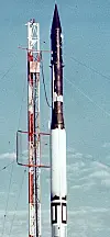 "Bæreraketten med satellitten Vanguard 1 står klar på oppskytningsrampen."