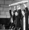 "Gruppen bak Explorer 1, USAs første satellitt. Fra venstre: William Pickering, sjefen for Jet Propulsion Laboratory. I midten står James Van Allen som oppdaget strålingsbeltene i atmosfæren som i dag bærer hans navn. Til høyre er Wernher von Braun, designeren av bæreraketten til Explorer 1."