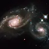 To galakser krasjer sammen i stjernebildet Krepsen. (Foto: NASA/ESA Hubble Space Telescope)