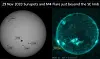 Bildet viser solen med forskjellige filtre. Bildet til høyre viser selve flekkene, med tilhørende navn, mens bildet til høyre viser magnetisk aktivitet. Disse bildene er altså fra 29. november 2020.(Bilde: NOAA)